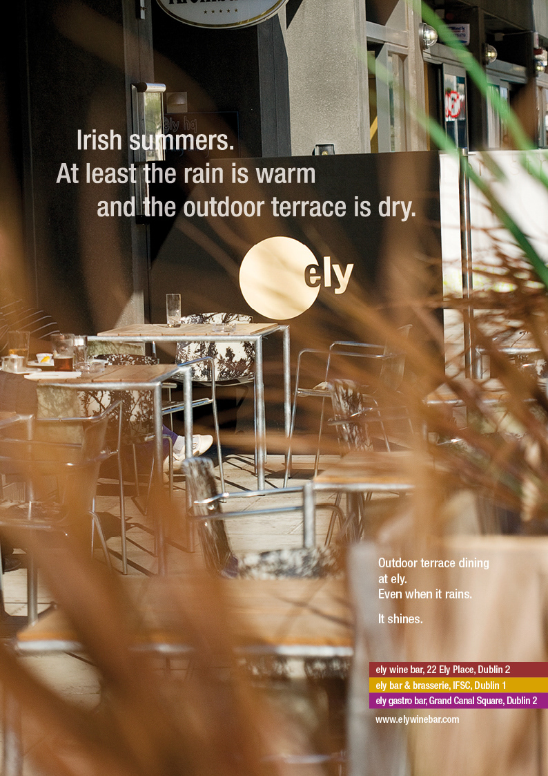 Additional executions to existing advertising and marketing campaign for ely wine bars talking about food provenance, ingredients, wine sourcing and the ely organic family farm in the Burren, Co. Clare. Art direction Francis Curran, Copywriting Jonathan Stanistreet, Photography Trevor Hart.