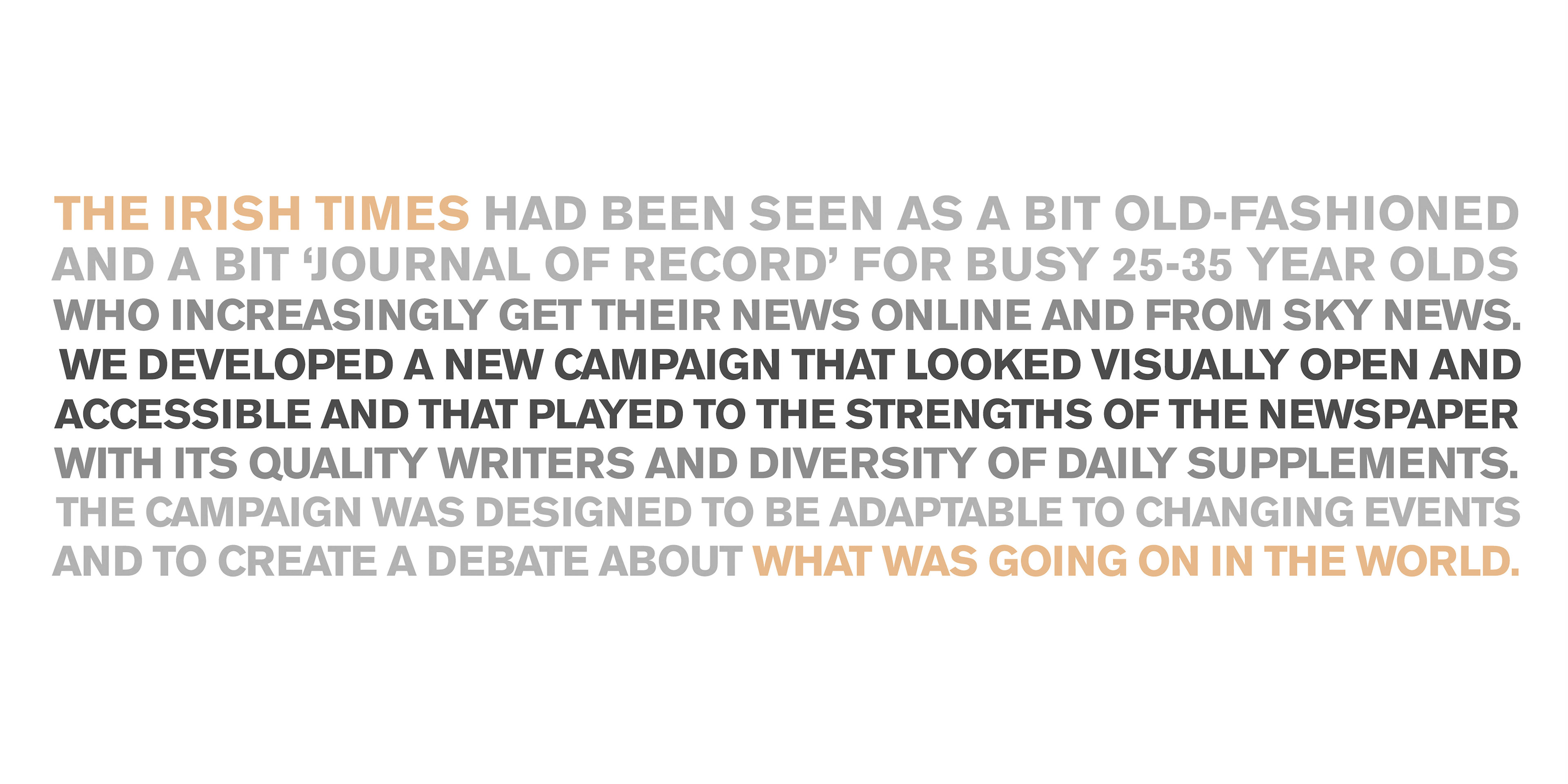 Design of advertising campaign for The Irish Times newspaper to reposition to a younger audience by emphasizing it's relevance to them. Also to emphasise the range of daily supplements within the newspaper.